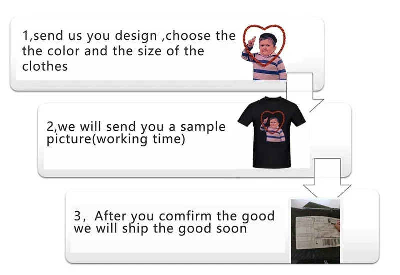 Our T-shirts are in European size,High quality pure cotton,Hope you can place an order when sending pic or text, so that we will make a sample for you soon. (If you are not satisfied with the design before shipping, we will not ship, you can apply for a refund at any time)